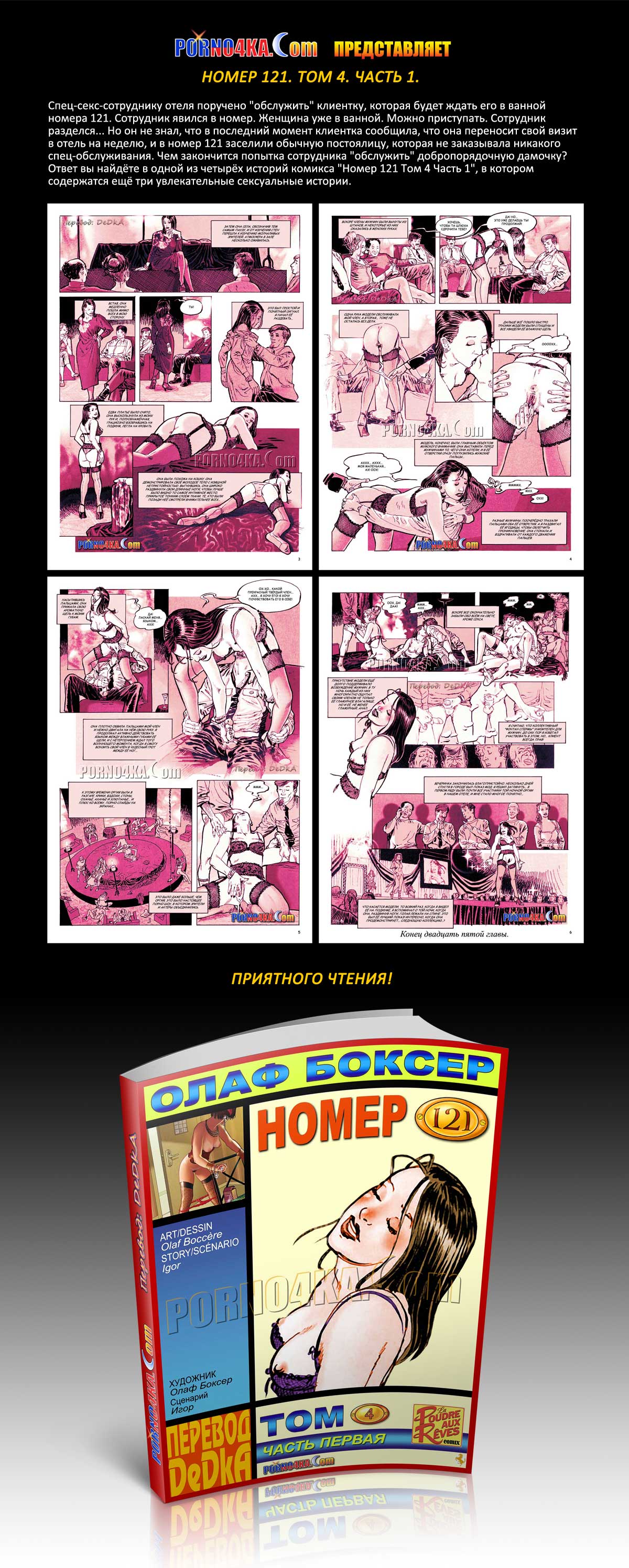 Спец-секс-сотруднику отеля поручено «обслужить» клиентку, которая будет ждать его в ванной номера 121. Сотрудник явился в номер. Женщина уже в ванной. Можно приступать. Сотрудник разделся… Но он не знал, что в последний момент клиентка сообщила, что она переносит свой визит в отель на неделю, и в номер 121 заселили обычную постоялицу, которая не заказывала никакого спец-обслуживания. Чем закончится попытка сотрудника «обслужить» добропорядочную дамочку? Ответ вы найдёте в одной из четырёх историй комикса «Номер 121 Том 4 Часть 1», в котором содержатся ещё три увлекательные сексуальные истории.