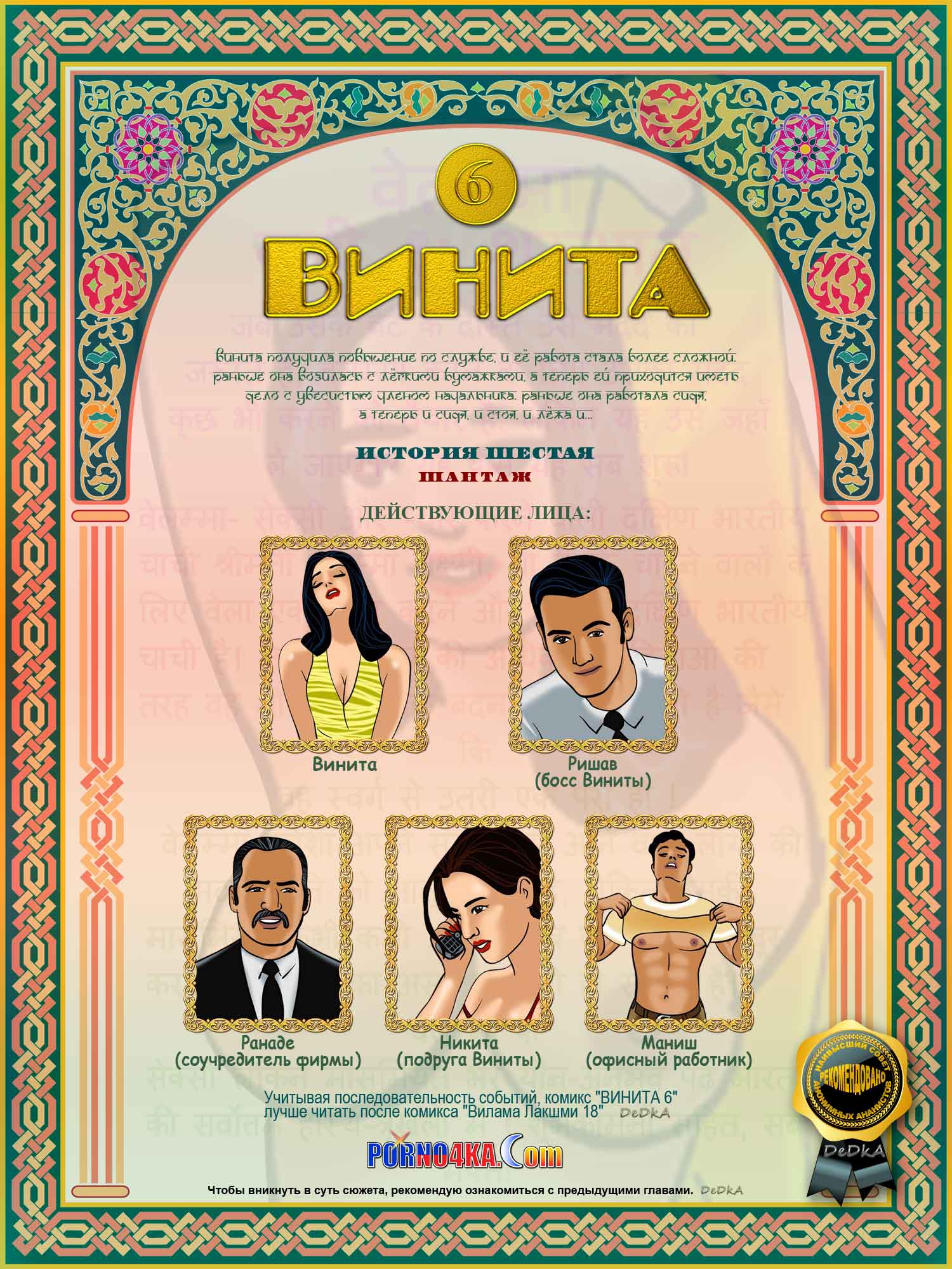 Непосредственный начальник Виниты, довольный тем, как она в прошлом выпуске комикса «Винита 5 — Ночная работа» удовлетворила его, ходатайствует перед боссом о повышении ее оклада, и с самого утра уводит ее в свой кабинет. Там она приступает к своим новым обязанностям, которые труднее прежних. Раньше она возилась с легкими бумажками, а теперь ей приходится иметь дело с увесистым членом начальника. Раньше она работала сидя, а теперь и сидя, и стоя, и лежа и… по всякому. Один из отвергнутых ею сотрудников офиса ухитряется сфотографировать, как она ублажает начальника. Вечером, когда уставшая от новой работы Винита развлекается со своей подружкои Никитой, хитрый «фотограф» присылает ей на телефон сообщение с фотками, и предлагает встретиться в отеле. Перепуганная Винита вынуждена немедленно отправиться к нему, и согласиться на все, в обмен на обещание уничтожить фотографии. После чего шантажист так сильно надругался над честной девушкой, что ей это даже понравилось! Вдобавок ко всему, он заявил, что передумал уничтожать фотки, и намерен повторять свой шантаж каждый день! Винита решает, во что бы то ни стало, прекратить это безобразие…